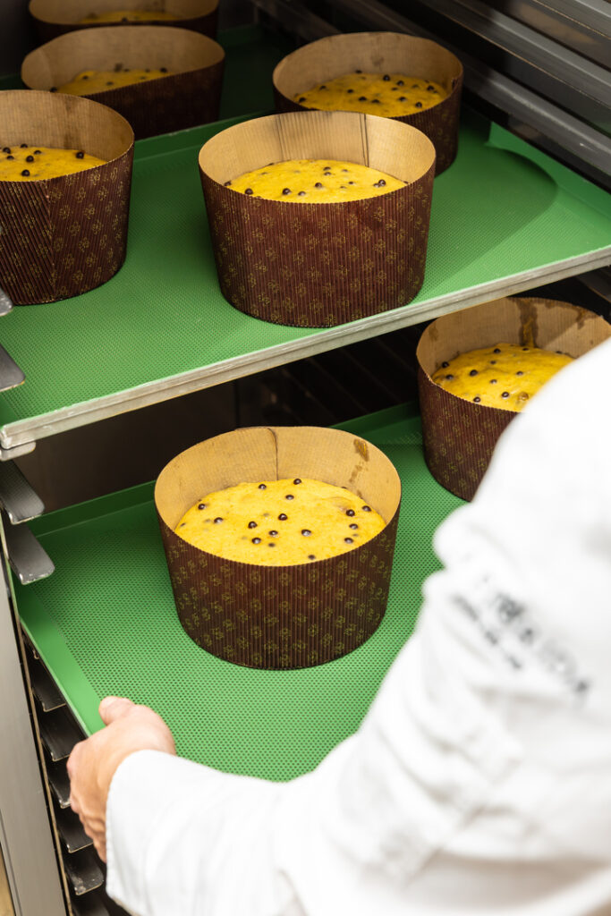 The following day, the second dough takes shape, enriched with candied orange paste, honey, powdered hay, candied chestnuts, and 70% dark chocolate drops. After shaping, the panettoni undergo a further 8 hours of leavening in their paper molds.