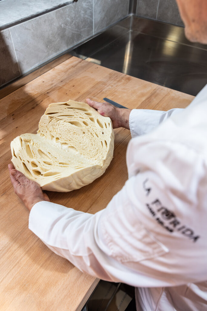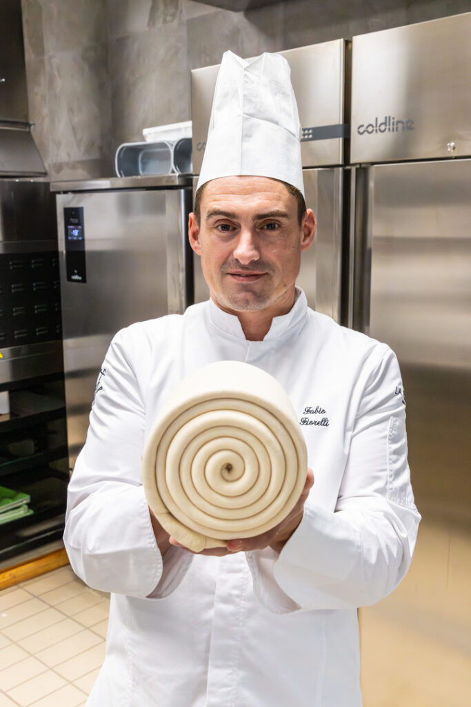 The preparation begins in the evening with the first dough, made using high-strength flour, butter from La Fiorida Dairy, produced from Bruna Alpina milk, Selva eggs from free-range hens raised in woodland areas, sugar, and time. The dough rests for 12 hours, developing structure, aromas, and a balanced aromatic base.
